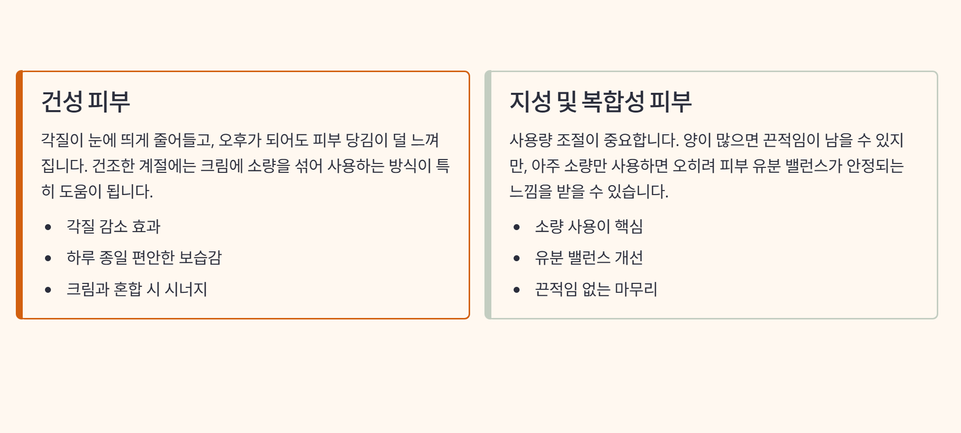 건성 피부의 경우, 각질이 눈에 띄게 줄어들고 오후가 되어도 피부 당김이 덜 느껴졌습니다. 특히 건조한 계절에는 크림에 소량을 섞어 사용하는 방식이 도움이 된다고 느꼈습니다. 사용 후 피부가 한결 편안해지는 느낌을 받았습니다.