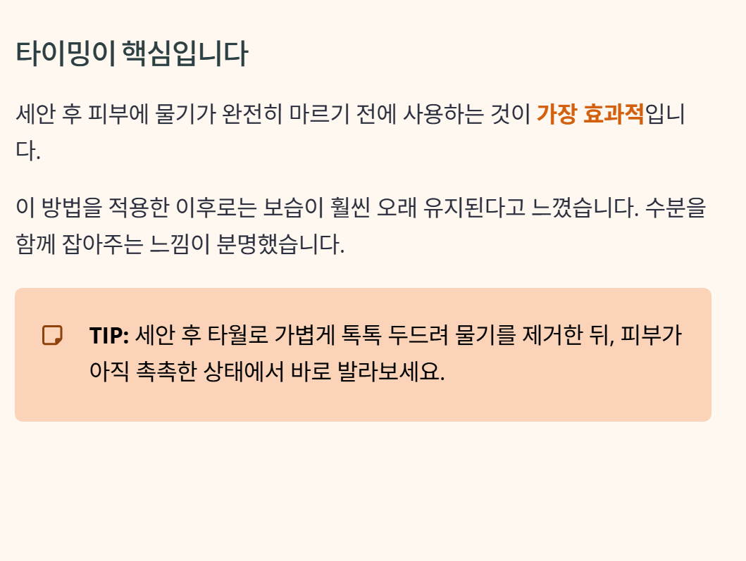 세안 후 피부에 물기가 완전히 마르기 전에 사용하는 것이 가장 효과적이었습니다. 이 방법을 적용한 이후로는 보습이 훨씬 오래 유지된다고 느꼈습니다. 수분을 함께 잡아주는 느낌이 분명했습니다.