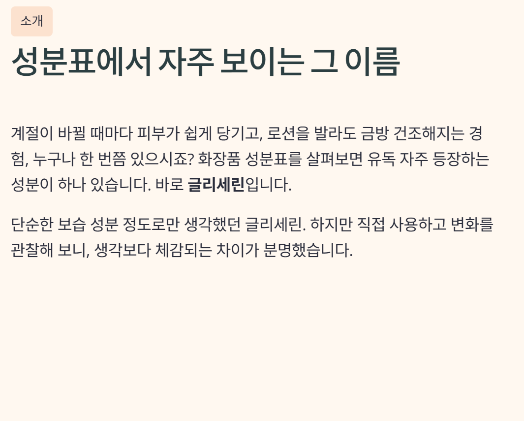 계절이 바뀔 때마다 피부가 쉽게 당기고, 로션을 발라도 금방 건조해지는 느낌을 받는 경우가 많았습니다. 성분표를 하나씩 살펴보다 보니 유독 자주 눈에 들어오는 성분이 있었는데, 그것이 바로 글리세린이었습니다.