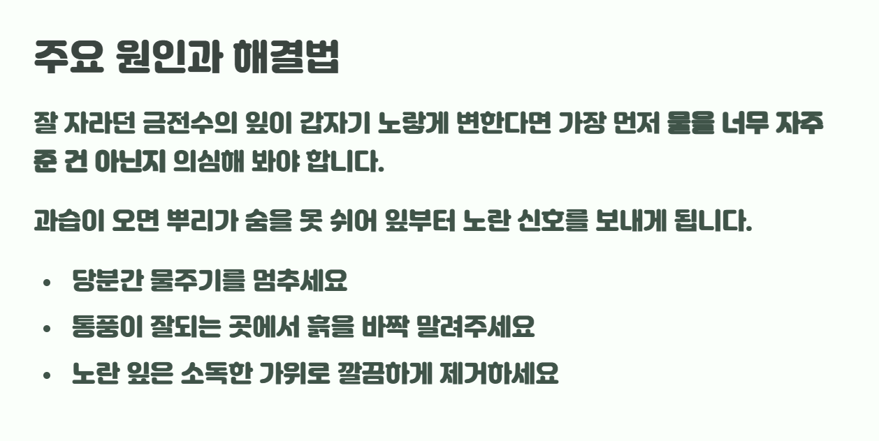 잘 자라던 금전수의 잎이 갑자기 노랗게 변한다면 가장 먼저 물을 너무 자주 준 건 아닌지 의심해 봐야 합니다. 과습이 오면 뿌리가 숨을 못 쉬어 잎부터 신호를 보내거든요.