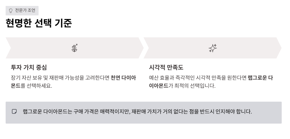 전문가 팁: 랩그로운 다이아몬드는 구매 가격은 매력적이지만, 재판매 가치가 거의 없다는 점을 반드시 인지해야 합니다. 투자 가치를 생각한다면 천연을, 시각적인 만족도와 예산 효율을 생각한다면 랩그로운을 추천합니다.