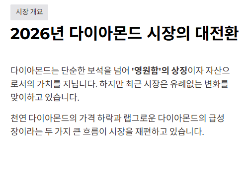- 천연 다이아몬드: 공급량이 줄어들고 있음에도 불구하고 수요의 상당 부분이 랩그로운으로 이동하며 전체적인 시세는 하방 압력을 받고 있습니다. 다만, '환금성(재매입 가치)' 측면에서는 여전히 유일한 대안입니다.