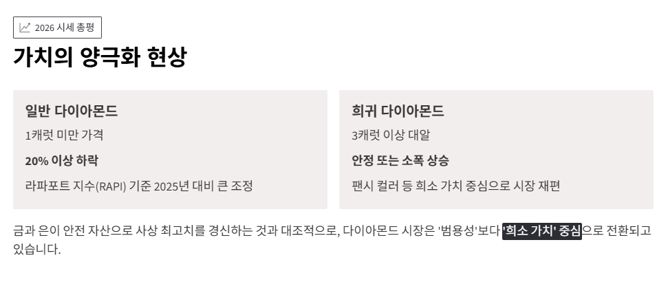 반면, **3캐럿 이상의 대알(High-Carat)**이나 팬시 컬러 다이아몬드와 같은 희귀물은 오히려 시세가 안정적이거나 소폭 상승하는 모습을 보입니다. 이는 금(Gold)이나 은(Silver)이 안전 자산으로서 사상 최고치를 경신하고 있는 것과 대조적이며, 다이아몬드 시장이 '범용성'보다는 '희소 가치' 중심으로 재편되고 있음을 의미합니다.