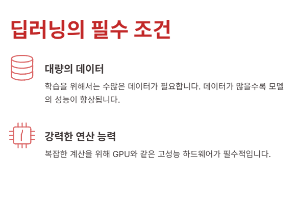 그래서 딥러닝에는 **많은 데이터와 강력한 연산 능력(GPU)**이 필수적으로 따라옵니다.
