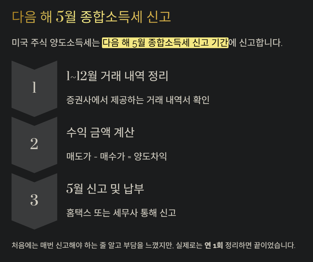 미국 주식 양도소득세는 다음 해 5월 종합소득세 신고 기간에 신고한다.