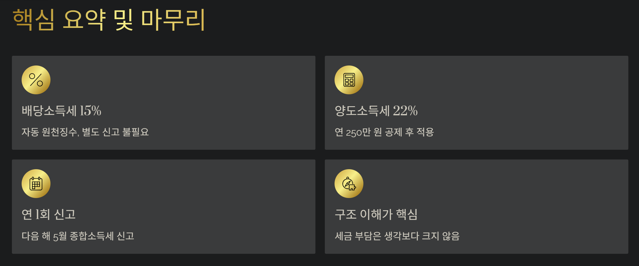 이 글을 통해 기본 틀만 잡아도 투자에 대한 불안이 많이 줄어들 거라 생각한다. 나 역시 그렇게 정리했고, 지금은 세금 때문에 투자 판단을 흔들리지 않게 됐다고 정리해본다.