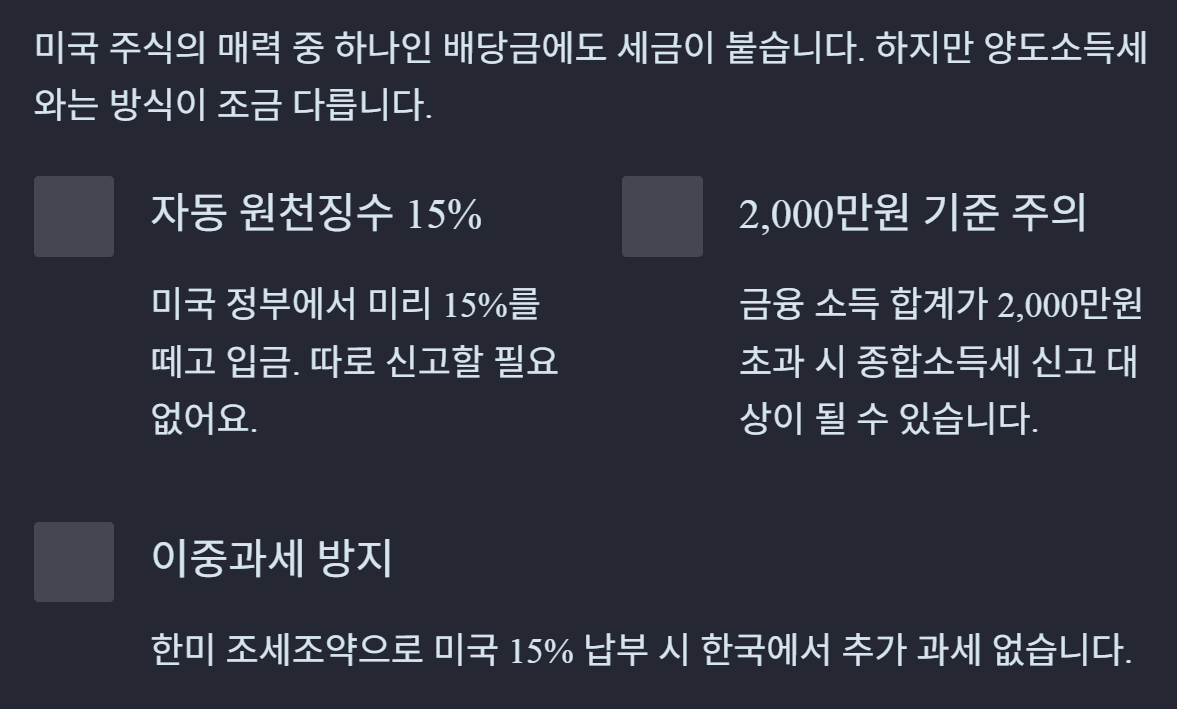 미국 주식의 매력 중 하나인 배당금에도 세금이 붙습니다. 하지만 양도소득세와는 방식이 조금 다릅니다.