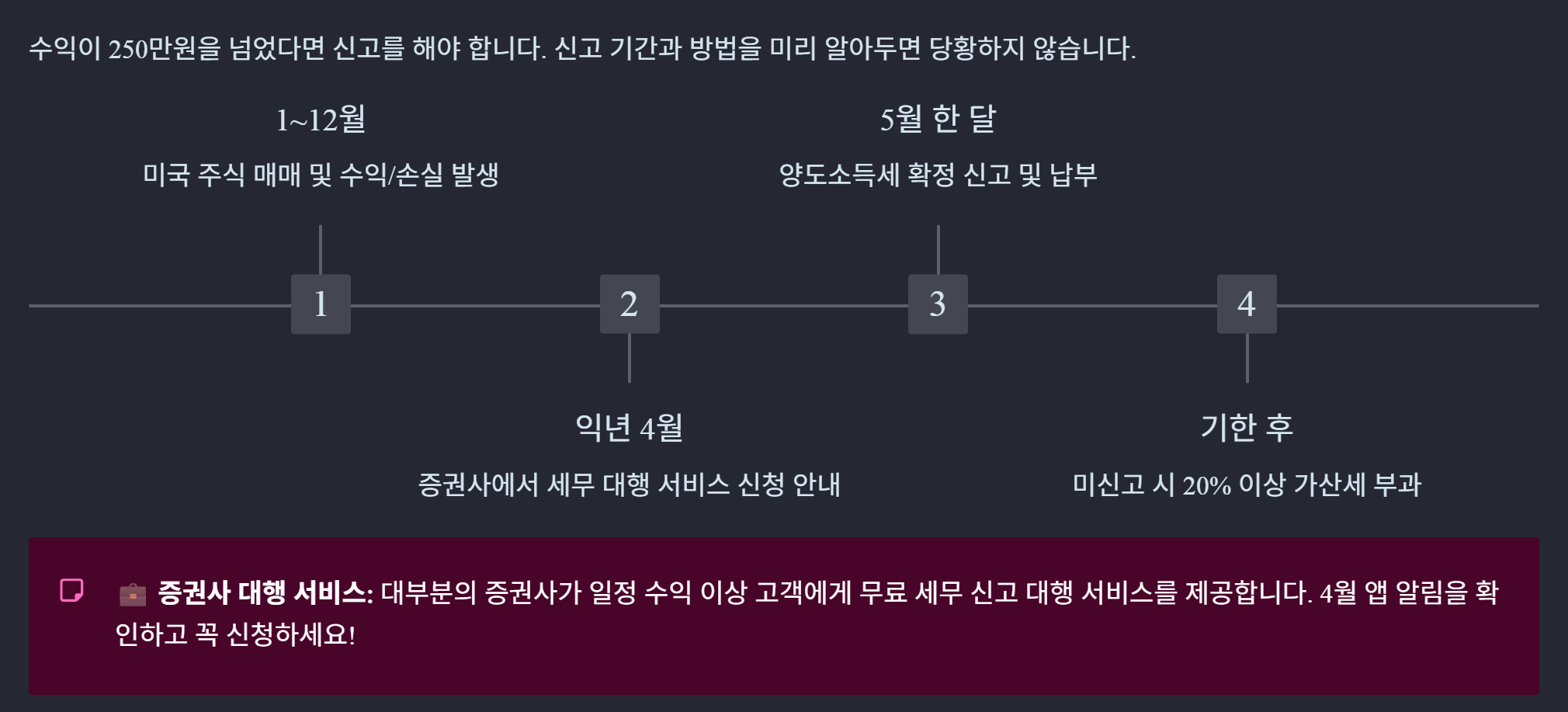 - 증권사 대행 서비스 활용: 개인이 직접 홈택스에서 신고하려면 복잡하고 어렵습니다. 다행히 대부분의 국내 증권사들은 일정 수익 이상 고객에게 **'해외 주식 세무 신고 대행 서비스'**를 무료로 제공합니다. 4월쯤 증권사 앱 알림을 확인하고 신청만 하면 세무사가 대신 처리해 주니 꼭 활용하세요.