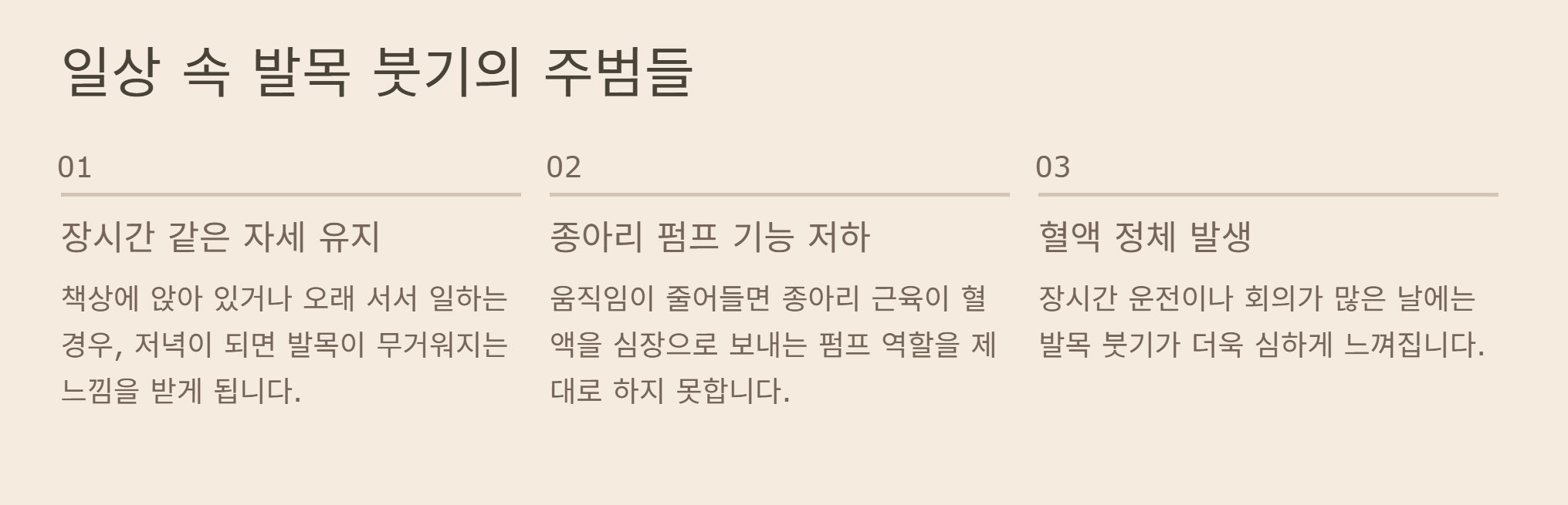 장시간 같은 자세를 유지하면 종아리 근육의 펌프 역할이 줄어들어 혈액이 정체되기 쉽습니다. 저도 장시간 운전이나 회의가 많은 날에는 발목 붓기가 더 심하게 느껴졌습니다.