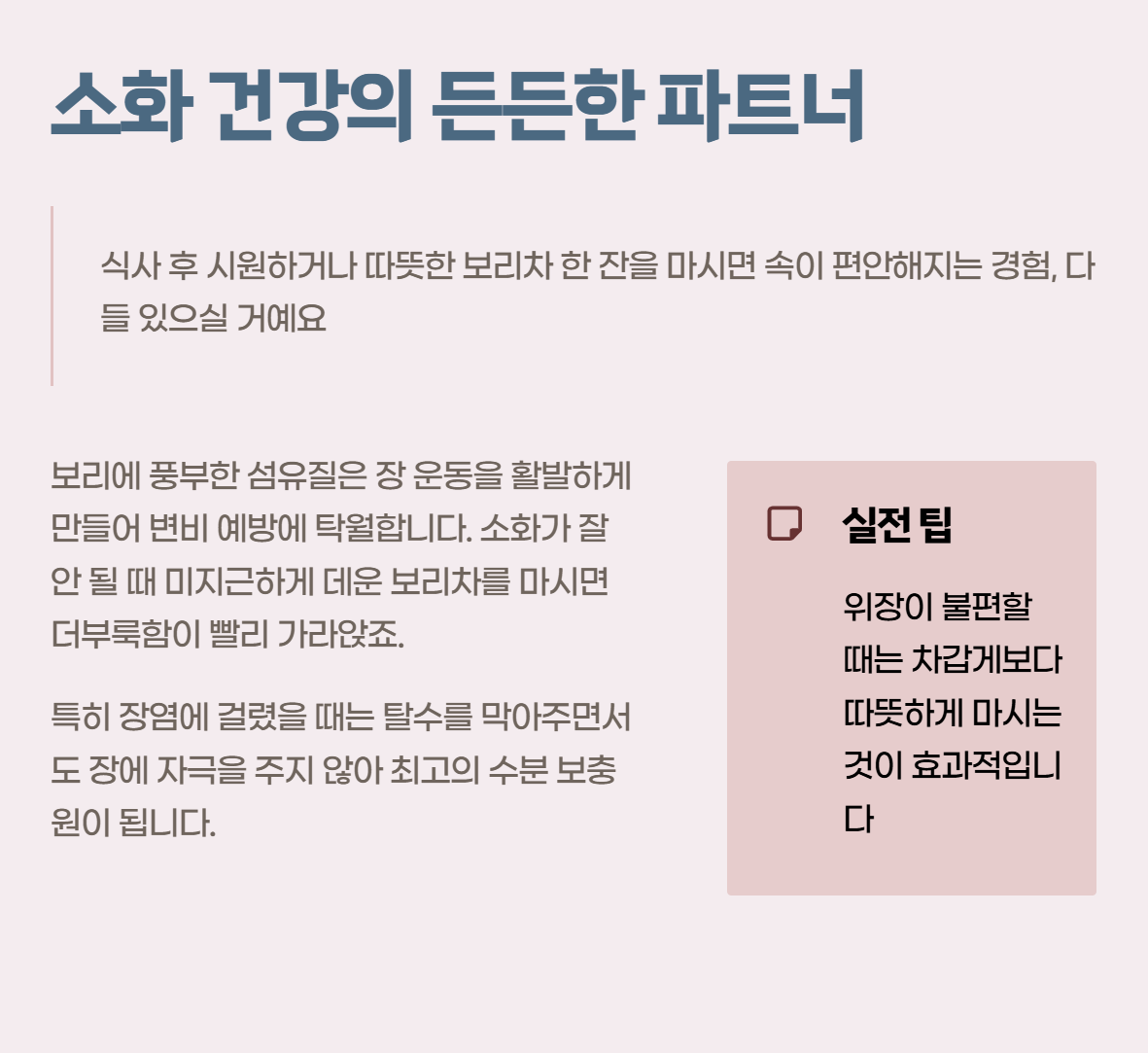 식사 후에 시원하거나 따뜻한 보리차 한 잔을 마시면 속이 편안해지는 경험, 다들 있으실 거예요. 보리에는 섬유질이 풍부해서 장 운동을 돕고 변비를 예방하는 데 도움을 줍니다.