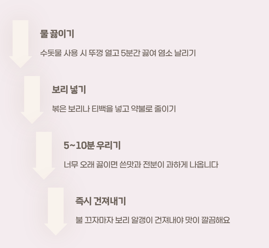 집에서 직접 보리를 볶거나 티백을 쓰실 때, 물이 팔팔 끓기 시작하면 불을 줄이고 약 5~10분 정도만 더 끓여주세요. 너무 오래 끓이면 쓴맛이 올라오고 전분이 과하게 나와 금방 상할 수 있습니다.