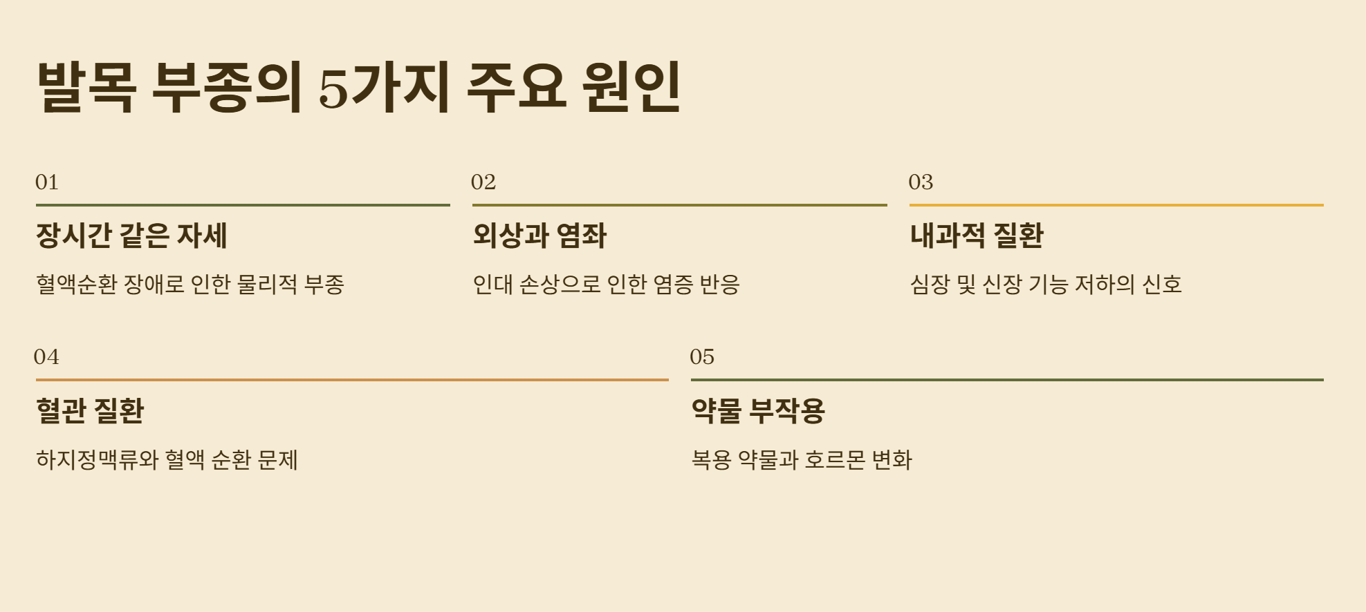발목이 붓는 이유는 이처럼 가벼운 생활 습관부터 무거운 전신 질환까지 매우 다양합니다. 대부분은 휴식과 스트레칭으로 해결되지만, 우리 몸이 보내는 작은 경고를 무시하지 않는 태도가 큰 병을 막는 비결이 아닐까 싶습니다.