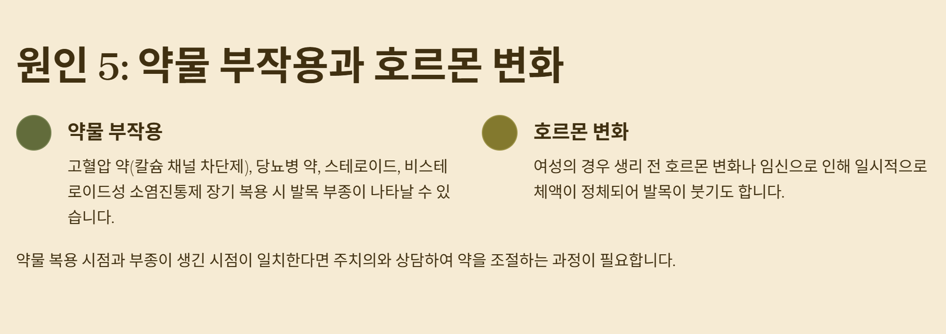 복용 중인 약물이 원인이 되기도 합니다. 고혈압 약(칼슘 채널 차단제), 당뇨병 약, 스테로이드, 혹은 비스테로이드성 소염진통제를 장기 복용할 경우 부작용으로 발목 부종이 나타날 수 있습니다. 또한 여성분들의 경우 생리 전 호르몬 변화나 임신으로 인해 일시적으로 체액이 정체되어 발목이 붓기도 하죠.