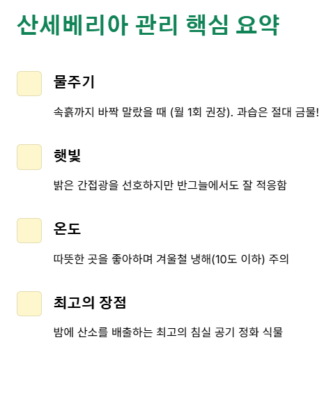 - 겨울철 주의사항: 산세베리아는 추위에 매우 약합니다. 기온이 10도 이하로 떨어지면 냉해를 입기 쉬우니 겨울에는 반드시 따뜻한 실내로 옮겨주시고, 이때는 물주기를 아예 멈추는 것이 안전합니다.