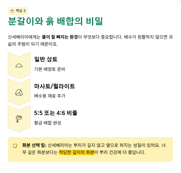 저는 일반 상토에 마사토나 펄라이트를 5:5 혹은 4:6 비율로 섞어서 사용합니다. 배수가 잘되지 않는 흙은 수분을 너무 오래 머금고 있어 과습의 주범이 되기 때문이죠. 또한, 산세베리아는 뿌리가 깊지 않고 옆으로 퍼지는 성질이 있으니 너무 깊은 화분보다는 적당한 깊이의 화분을 선택하는 것이 뿌리 건강에 좋습니다.