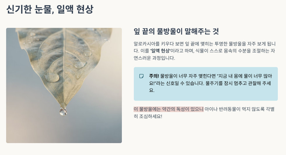 알로카시아를 키우다 보면 가장 신기한 장면이 바로 잎 끝에 맺히는 물방울일 거예요. 이를 '일액 현상'이라고 하는데, 식물이 스스로 몸속의 수분을 조절하는 자연스러운 과정입니다. 하지만 이 물방울이 너무 자주 맺힌다면 "지금 내 몸에 물이 너무 많아요!"라는 신호일 수 있으니 물주기를 잠시 멈추고 관찰해 주는 것이 좋습니다. (주의: 이 물방울에는 약간의 독성이 있으니 아이나 반려동물이 먹지 않게 조심하세요!)