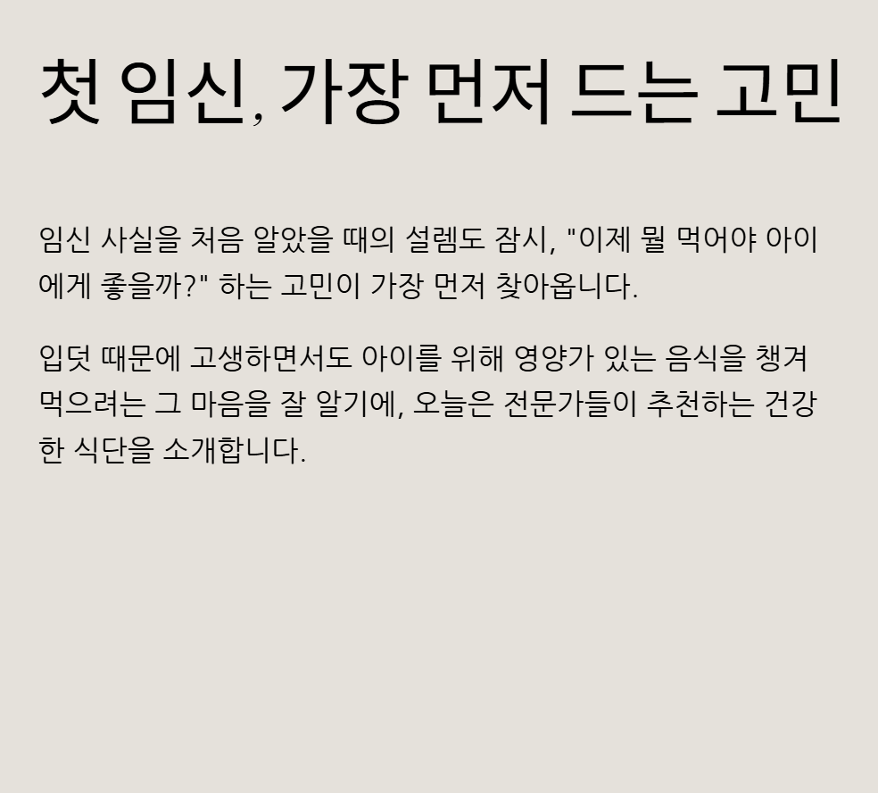 아이를 기다리는 열 달이라는 시간 동안 무엇보다 중요한 건 엄마의 마음 편한 식사 시간인 것 같아요. 너무 강박을 갖기보다는 오늘 소개해 드린 건강한 음식들을 하나씩 식탁에 올려보며 즐겁게 식사하시길 바랍니다.