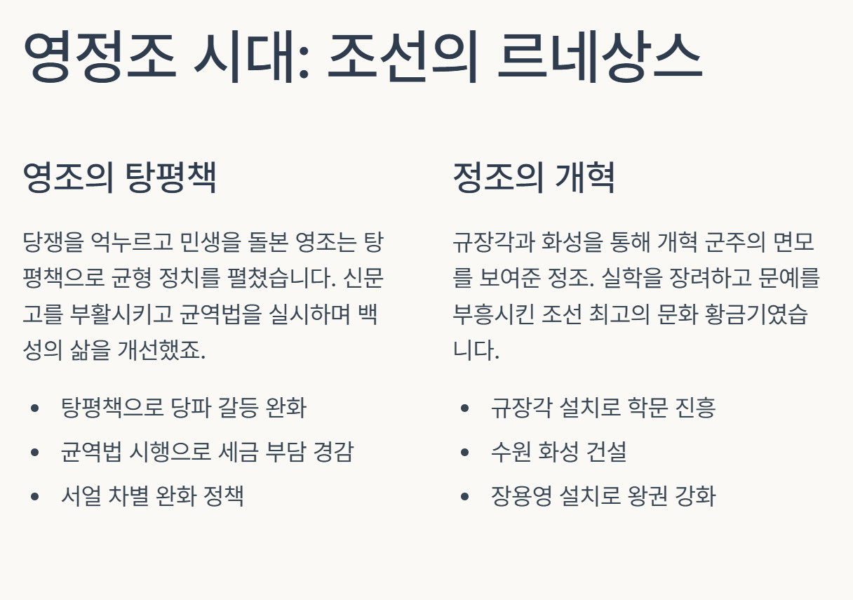 조선판 '르네상스'라고 불리는 시기입니다. 영조는 탕평책을 통해 당쟁을 억누르고 민생을 돌봤으며, 그의 손자 정조는 규장각과 화성을 통해 개혁 군주의 면모를 보여주었습니다. 이때가 조선 역사상 가장 찬란했던 마지막 불꽃이었던 것 같아요.