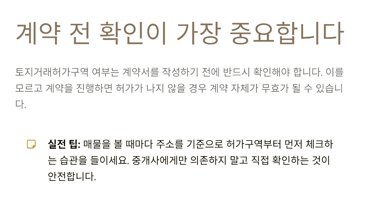 토지거래허가구역 여부는 계약서 쓰기 전에 반드시 확인해야 한다. 이를 모르고 계약을 진행하면 허가가 나지 않을 경우 계약 자체가 무효가 될 수 있다. 그래서 나는 매물을 볼 때마다 주소를 기준으로 허가구역부터 먼저 체크하는 습관이 생겼다.