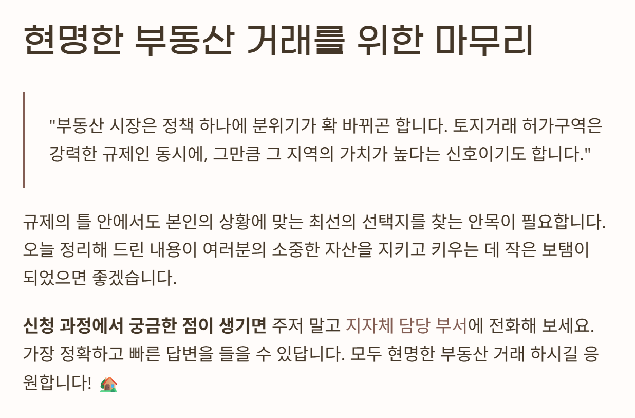 부동산 시장은 정책 하나에 분위기가 확 바뀌곤 하죠. 토지거래 허가구역은 강력한 규제인 동시에, 그만큼 그 지역의 가치가 높다는 신호이기도 합니다. 규제의 틀 안에서도 본인의 상황에 맞는 최선의 선택지를 찾는 안목이 필요한 시점인 것 같아요.