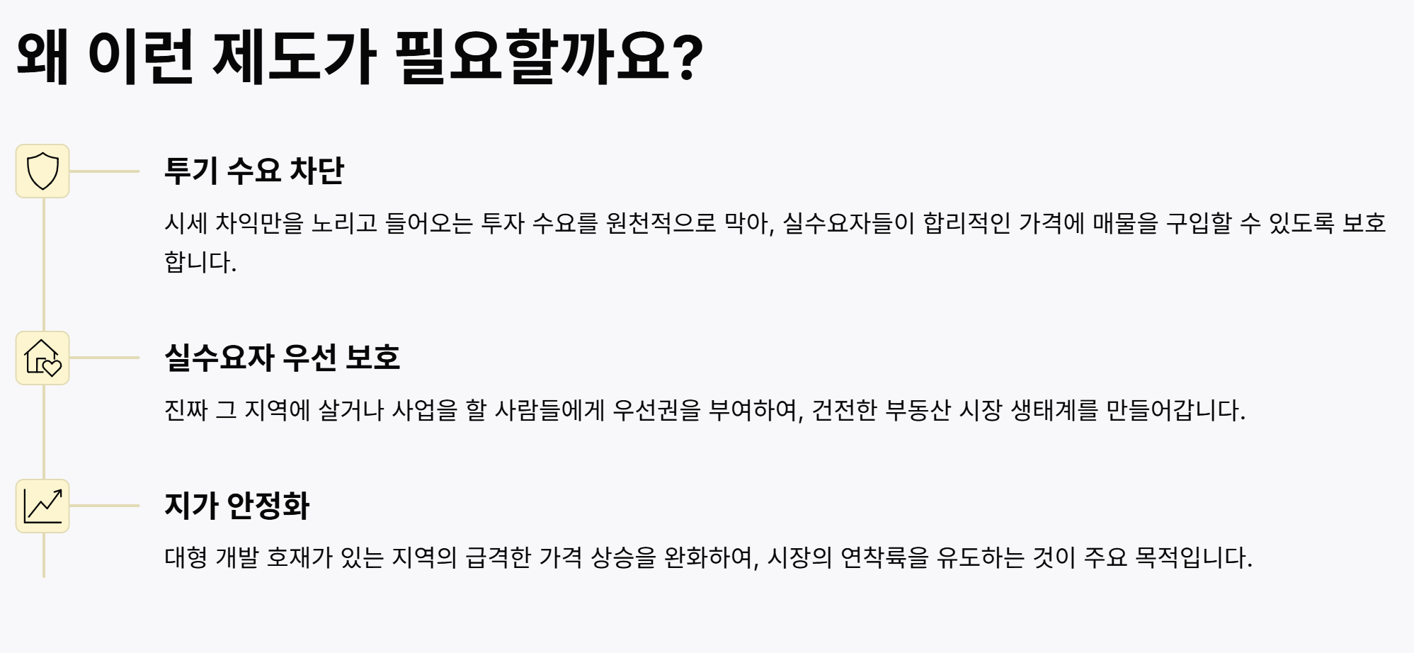 이 제도의 핵심은 '실수요자'만 집이나 땅을 사라는 겁니다. 시세 차익만을 노리고 들어오는 투자 수요를 원천 차단해서 진짜 그 지역에 살거나 사업을 할 사람들에게 기회를 주려는 취지죠. 제가 지켜본 바로는 강남이나 용산처럼 대형 개발 호재가 있는 곳들이 주로 지정되곤 했습니다.