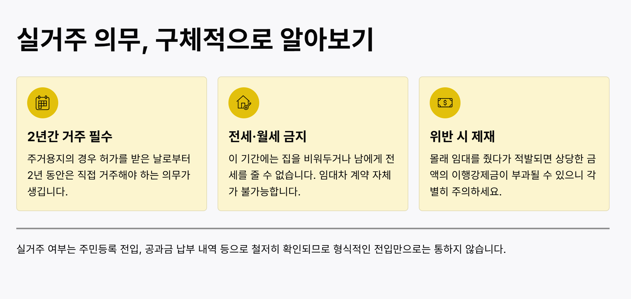 가장 중요한 포인트는 바로 '실거주'입니다. 일반적인 아파트 거래와 달리, 토지거래 허가구역 내 주택을 구입하면 반드시 본인이 직접 들어가 살아야 합니다. 소위 말하는 '갭투자'가 원칙적으로 불가능하다는 뜻이죠.