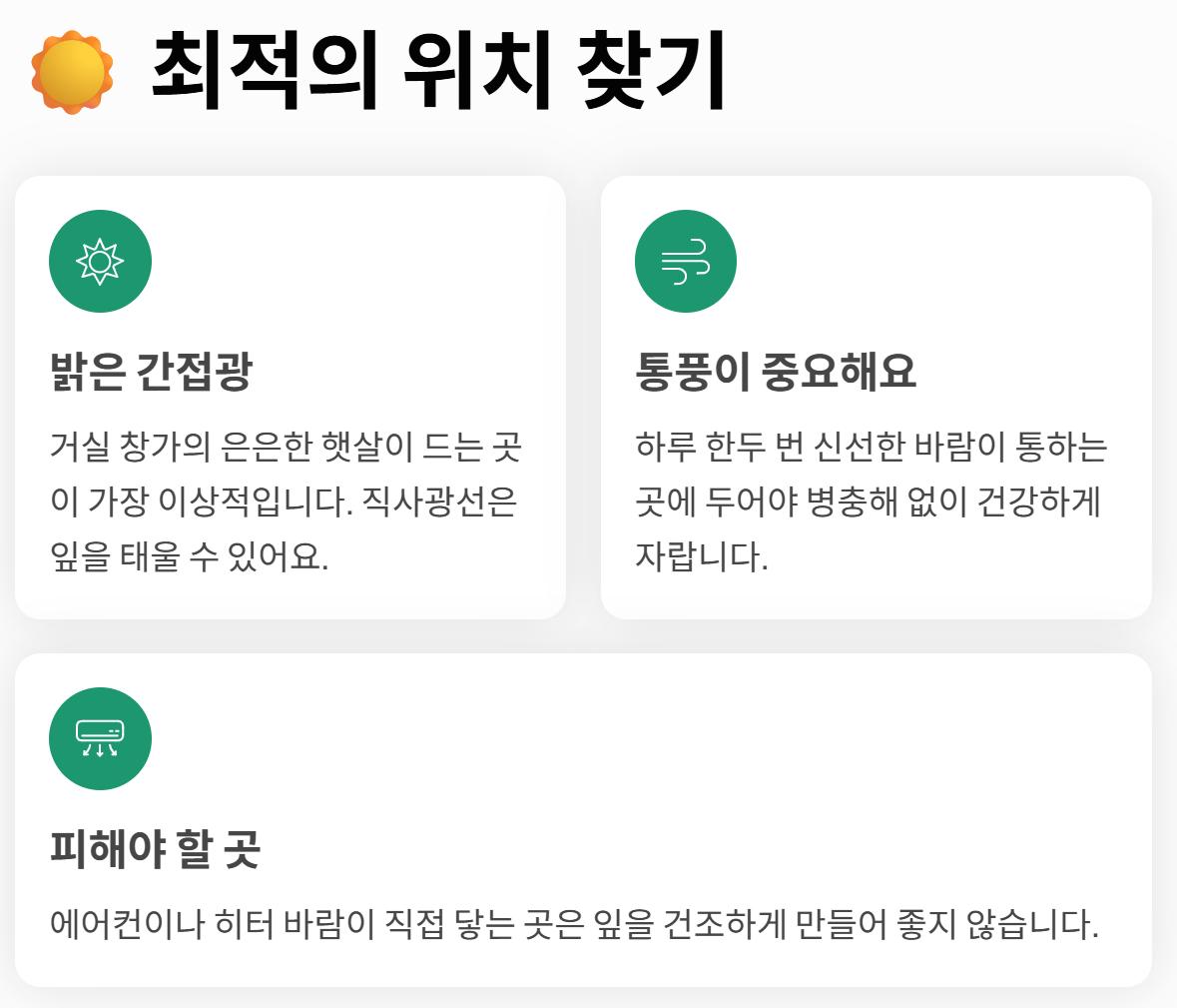 - 햇빛: 직사광선을 피한 밝은 실내가 가장 좋습니다.
