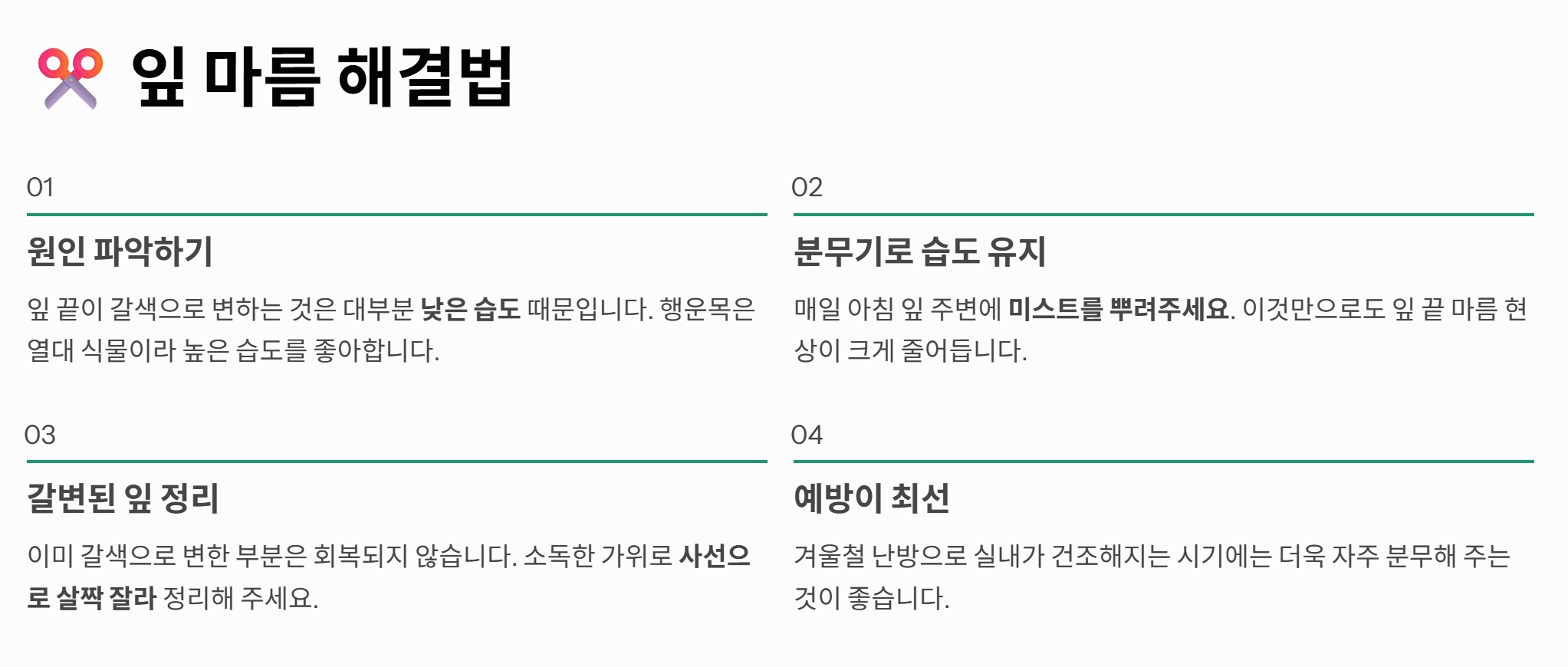 이미 갈색으로 변한 잎 끝은 다시 초록색으로 변하지 않습니다. 이럴 땐 소독한 가위로 원래 잎 모양을 살려 사선으로 살짝 잘라주면 보기에 훨씬 깔끔합니다. 너무 바짝 자르면 잎이 상할 수 있으니 갈색 부분만 살짝 남기고 잘라주시는 게 팁입니다.